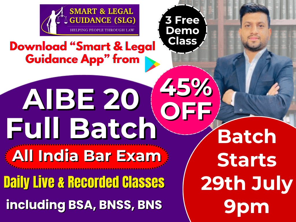 - Classes Begins from: 29th July (Daily 9pm) - Daily Live/Recorded Classes - Classes Preference (हिंदी/English) - Full AIBE 20 Syllabus - With BSA, BNSS, BNS - Latest Amendments - Latest Case Laws - Topic Wise MCQ Questions Solving - Notes PDF (Topic Wise) - Notes Available in English/Hindi - Validity of Recorded Classes & Notes (1 Year) - PDF Notes can be downloaded easily